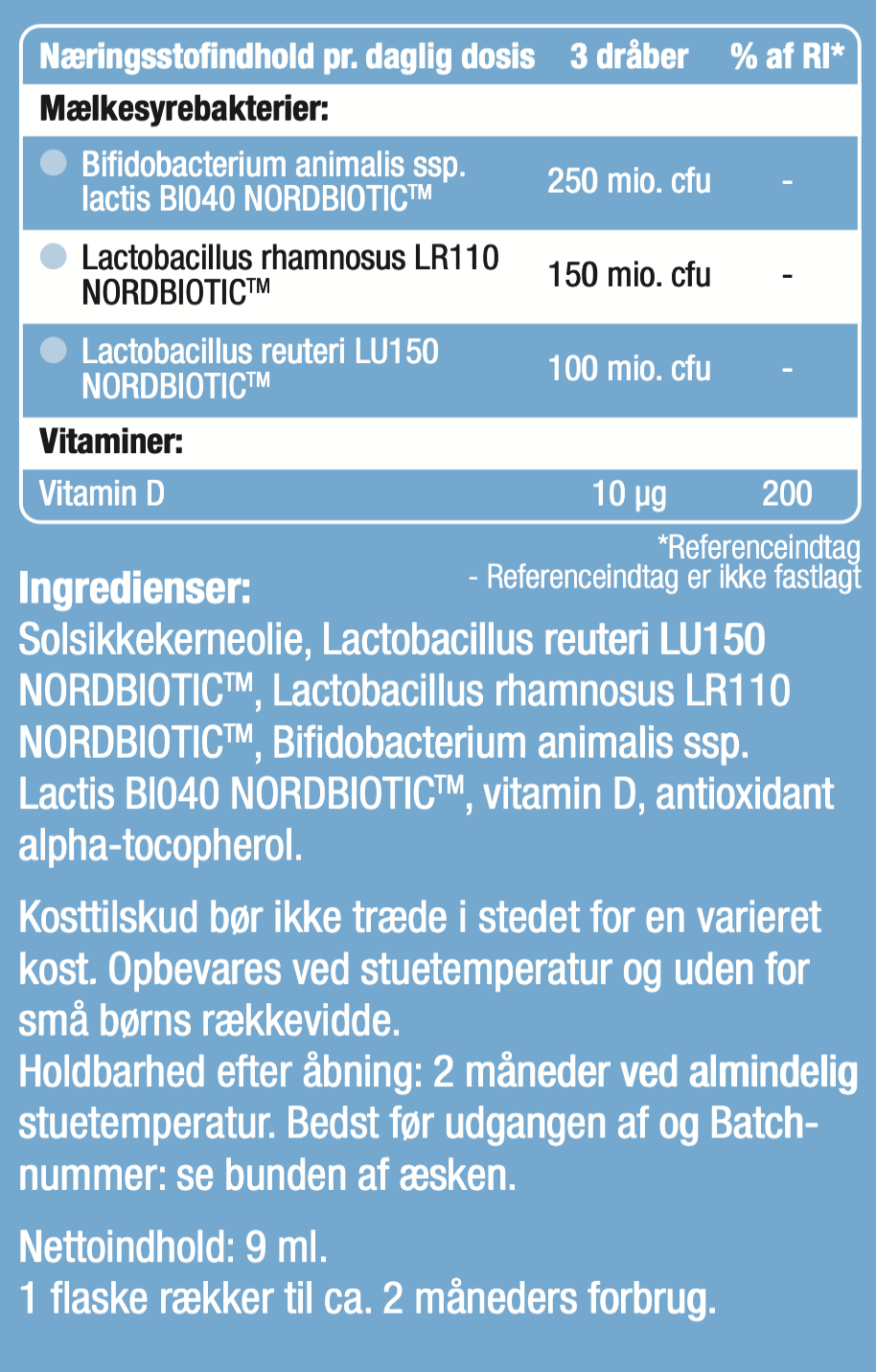 Babyvärn® er mælkesyrebakterier og vitamin D i solsikkeolie til familiens mindste, som tilfører 500 mio. lactobacillus og bifidobakterier til barnets mikrobiom. Vitamin D er en vigtig del af børns sundhed og bidrager til barnets normale vækst og knogleudvikling samt til immunforsvarets normale funktion. Sundhedsstyrelsen anbefaler en daglig dosis på 10 μg vitamin D, svarende til 3 dråber Babyvärn®, fra barnet er 2 uger til 4 år.