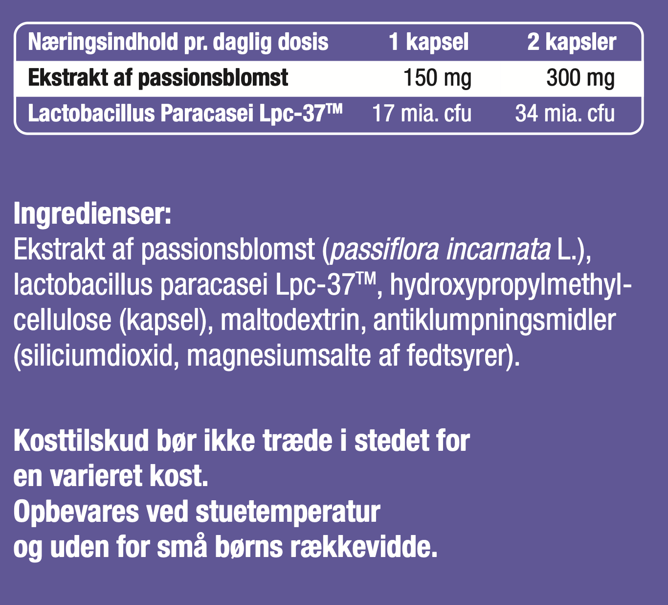 Calmvärn® er et kosttilskud med mælkesyrebakterier og *passionsblomst, som bidrager til at understøtte afslapning, fysisk og mental velbefindende samt en normal søvn. Produktet kan bruges af voksne over 18 år og indeholder 17 milliarder levende mælkesyrebakterier af stammen Lactobacillus paracasei Lpc-37™ og 150 mg ekstrakt af passionsblomst pr. kapsel.