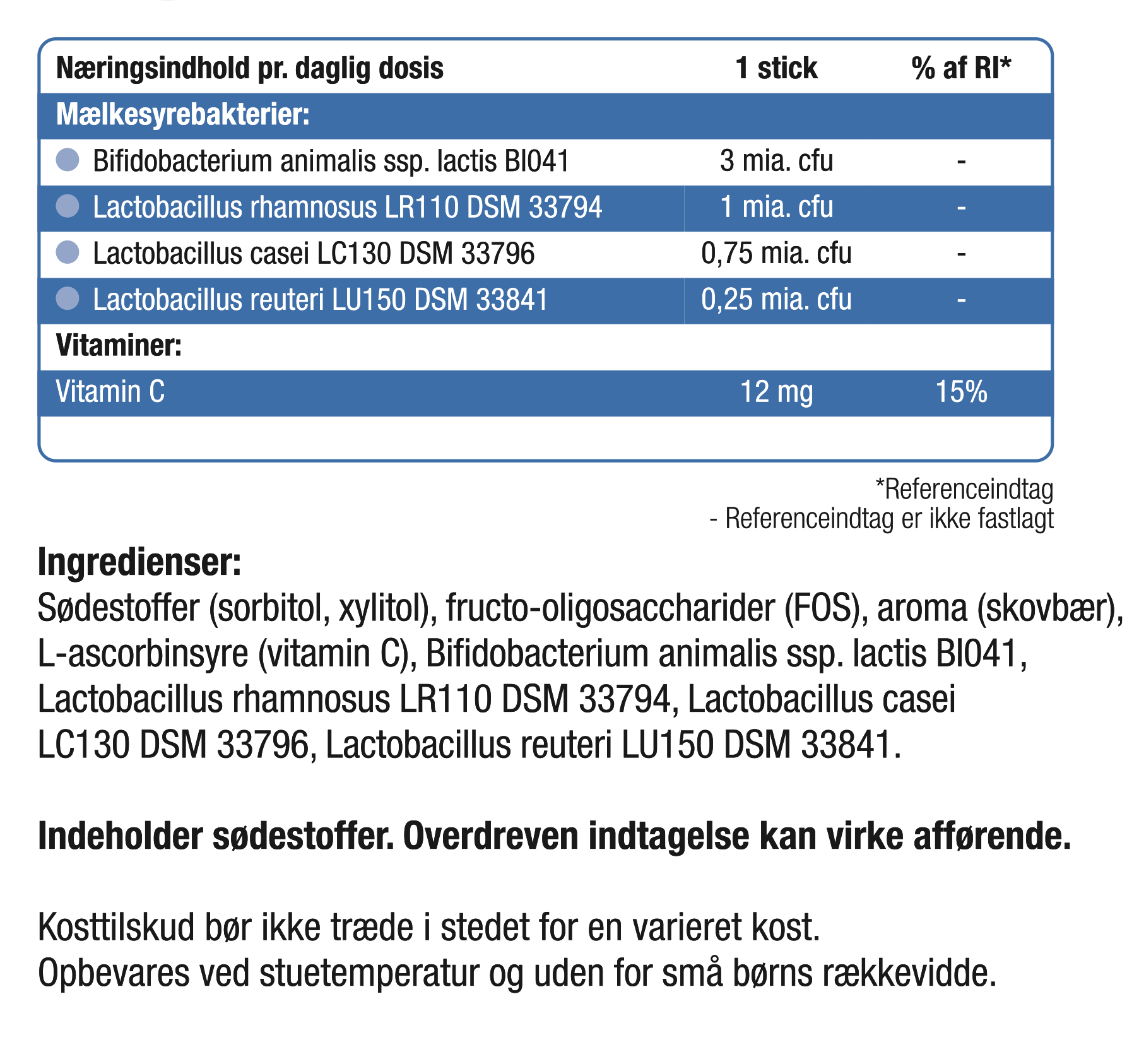 Kidsvärn® er hverdagsprodukt med mælkesyrebakterier og vitamin C til børn fra 3 år, med en naturlig smag af skovbær. Produktet indeholder 5 milliarder mælkesyrebakterier fordelt på 4 forskellige stammer, som både tilfører lactobacillus og bifidobakterier til barnets mikrobiom. Kidsvärn® kommer i praktiske sticks med pulver, som smelter hurtigt og nemt i munden. Perfekt til børnene sammen med den daglige multivitamin.